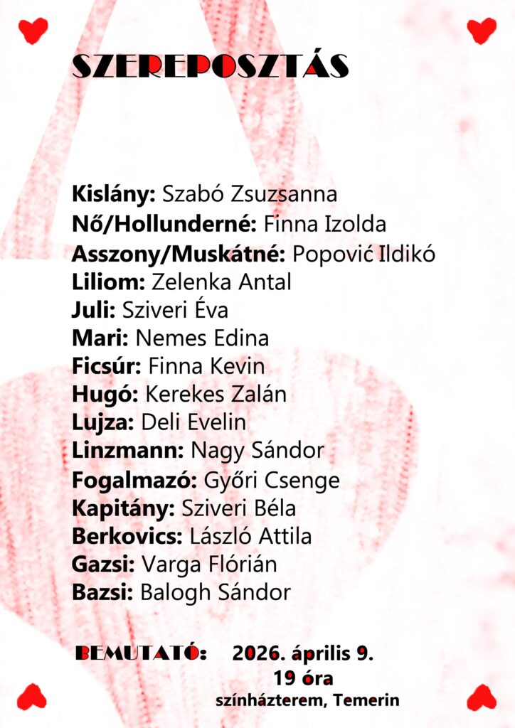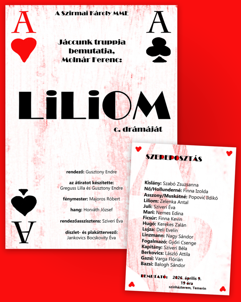 A Szirmai Károly MME Jáccunk truppja bemutatja, Molnár Ferenc: Liliom c. drámáját 2026. április 9-én 19 órai kezdettel a temerini színházteremben.